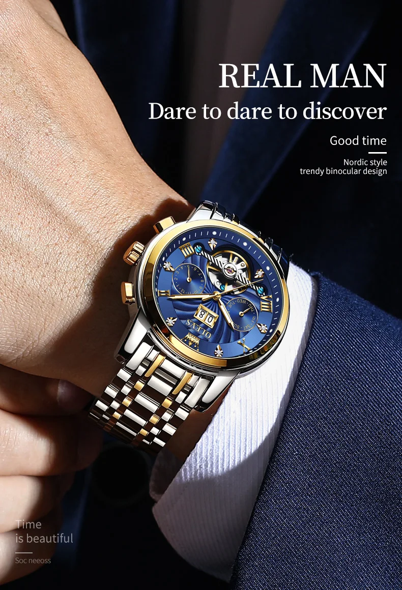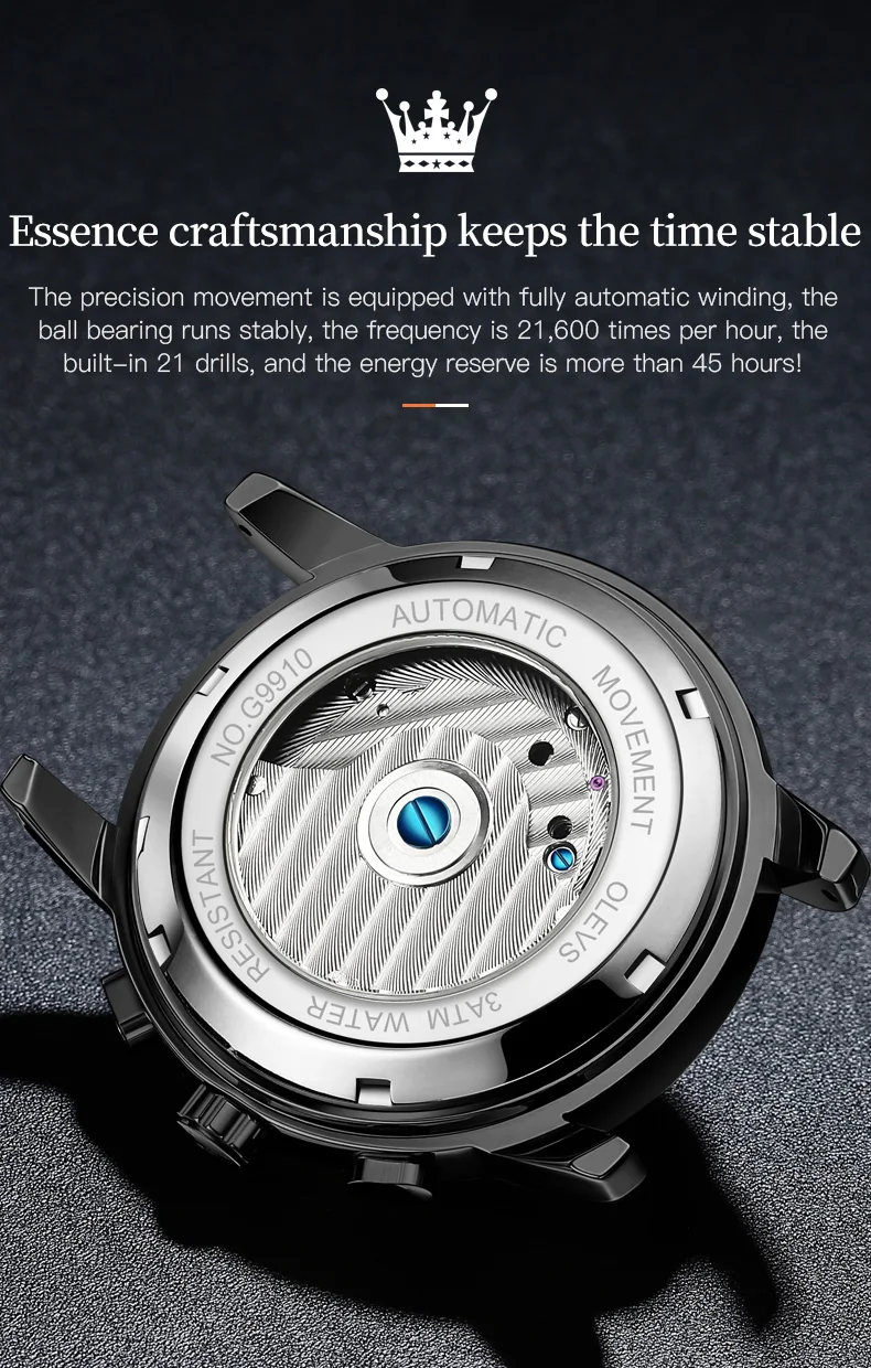 Com um design esqueleto que revela o funcionamento interno do mecanismo, ele é uma demonstração visível de potência e precisão. O movimento automático elimina a necessidade de bateria — basta o movimento natural do seu pulso para mantê-lo em funcionamento.